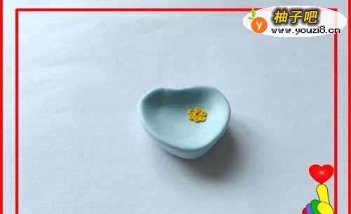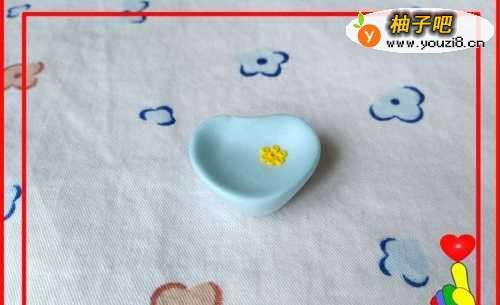 6最后取黄色彩泥适量,滚搓7个小圆点,将小圆点粘合在“爱心盘子”的右上角,成小花状。