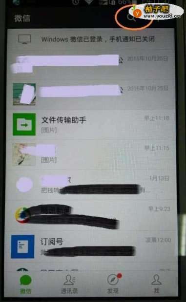 首先在手机上打开并登录微信,找到右上角的“搜索”功能;
