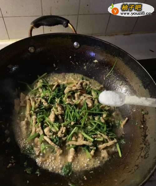 6倒入少许水,最后加入盐,炒一分钟,出锅