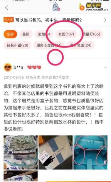 2翻到评价的页面,先点击“有图”,然后看里边的买家秀,这个时候就可以看看实物的样子,是不是有色差啥的问题,一般来说,卖家顶多用美图秀秀给p一下,和实物不会有太大的差别。