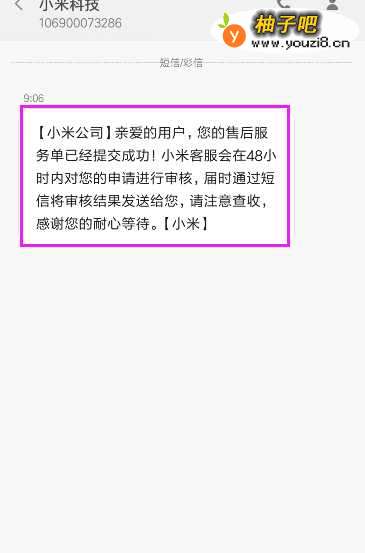9这时,你将会收到短信小米科技发来的短信信息,说你售后服务单已经提交成功!等待处理!