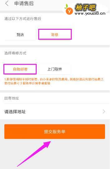 7来到这个页面,选择“寄修”,自助邮寄,选择“回寄地址”,也就是你的收货地址,如图所示