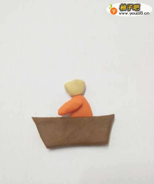 3用一块桔色捏成手指肚形状,粘在小船上,当作人的身体。