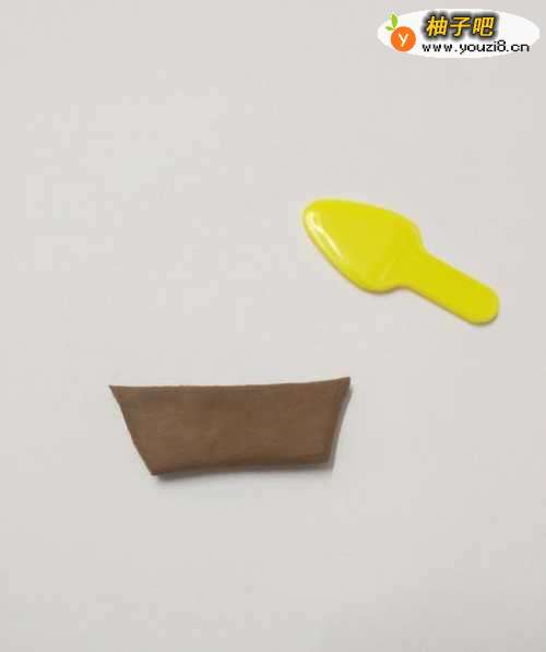 2先用一块棕色彩泥捏成扁片,用小刀切成梯形,当作小船。