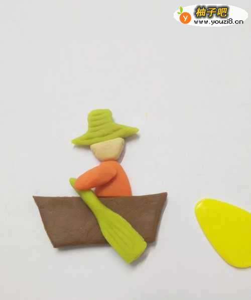 7再用黄彩泥捏一只浆,上窄下宽,粘在胳膊的左端,斜着粘在小船上。