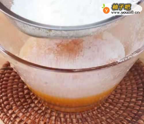 2加上30克白糖,适量食用油蚂始,筛入200克面粉。