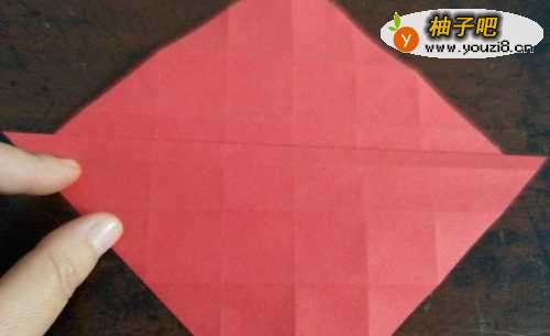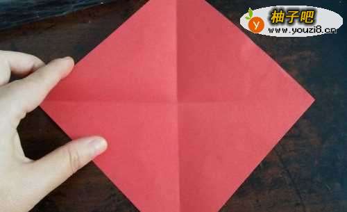 先把彩纸的对角线对折,再把上下角向内折。然后再把角向着折痕对折。