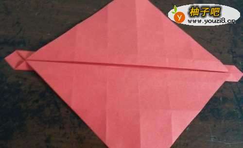 2打开后,把两角对折,如图二。然后把下侧的边上折一点,如图三。