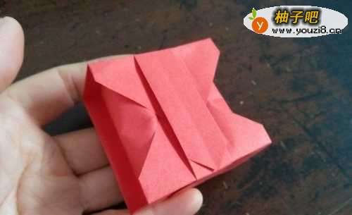 4另一侧同样操作,再把上下部分向内折,如图二。然后把另外两侧按照折痕向内折,如图三。