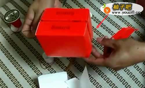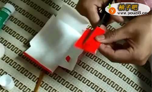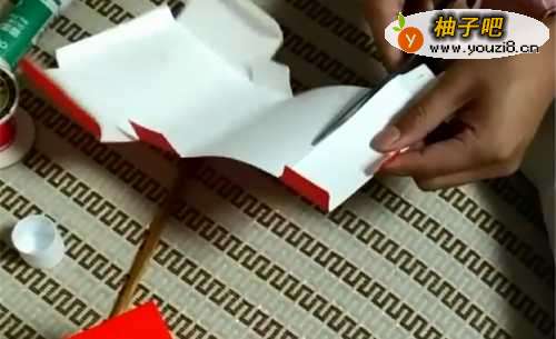3接下来再取一个纸盒,用剪刀剪成灯笼的小穗子。