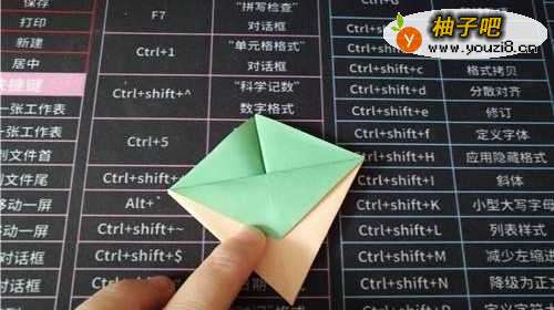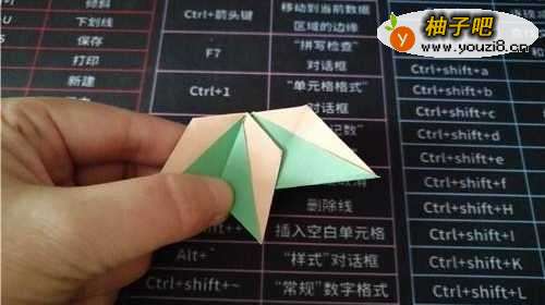 3然后再把折上去的角,向下折,如图一。打开彩纸后,按照折痕把彩纸折成图二的样子。
