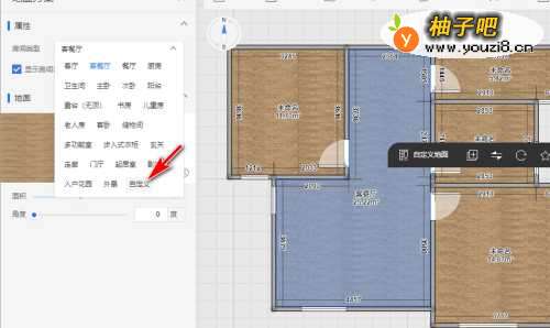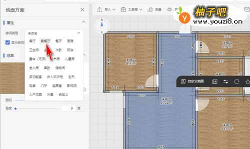 5在左侧会出现一个房间名的选项,我们点击后面的倒三角展开,选择一个预设的房间名字,比如客餐厅,点击,房间名称就改成了“客餐厅”。
