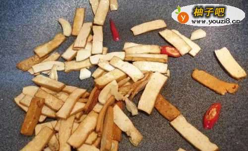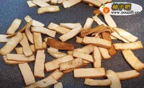 锅中加油,先将豆干煎到有点金黄