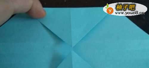 3放平后,把两侧的角向内折。打开后,再把两侧的角向内折,还是再把这个角向着刚折的折痕对折。