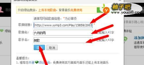 5如果正确,将网友发的链接复制,返回到你的QQ空间,点击添加网络背景音乐,把你的链接粘贴上去,填写歌名和歌手名,点击添加