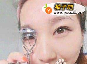 2先在整个眼窝涂上米白色眼影,再在整个眼窝靠太阳穴方向的位置画出咖啡色三角形眼影。使用睫毛夹将睫毛夹卷翘。粘上假睫毛。