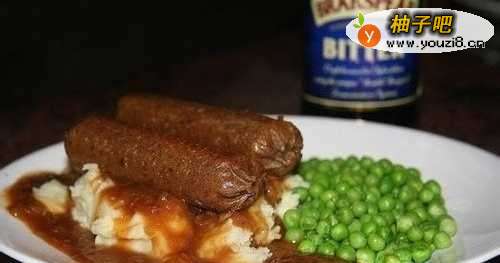 肉泥和土豆泥是通俗的说法,其实就是香肠和土豆泥一起吃。这道菜通常都和浓郁的洋葱肉汁一起食用。