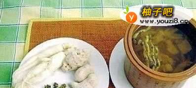 鱼腥草30克(鲜者加倍),大米100克,白糖适量。将鱼腥草择净,放入锅中,加清水适量,浸泡5~10分钟后,水煎取汁,加大米煮粥,或将鲜鱼腥草择洗干净,切细,待粥熟时调入粥中,纳入白糖,再煮一、二沸即成,每日1剂。可清热解毒,消痈排脓,利尿通淋。适用于粉刺,肺热咳嗽、湿热淋症,水肿尿少,湿热痢疾等。