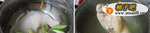 鸡腿洗净放入锅中,加2小碗清水、姜片和葱段煮熟。