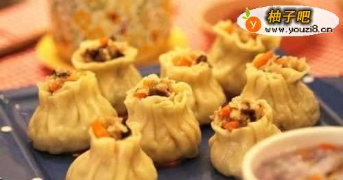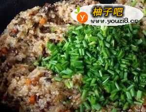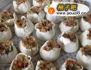 5等糯米饭微凉一会儿,最后再拌入葱叶。将面分成若干个做饺子大小的剂子,擀成饺子皮状。加入大量的烧卖馅儿。将带馅儿的面皮放在虎口处,另一个手的拇指按压虎口中间的馅儿,虎口收紧,掐出腰即可。