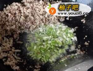 3将炒香的肉末铲至一边,用锅底的油爆香葱白,再和肉末翻炒均匀。将炒香的肉末和葱白铲至一边,用锅底的油爆香香菇和木耳丁,再和肉末葱白翻炒均匀。
