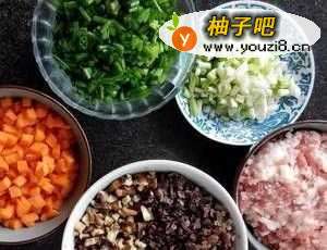 先清洗干净香菇,多加一些清水没过香菇,用微波炉加热一分钟,再浸泡十分钟,将香菇榨干水分取出,即可得到泡香菇的水。将洗净的糯米放入电饭煲,用泡香菇的水煮糯米饭,水量比米高出一个拇指指节即可。浸泡香菇的十分钟里,可以泡木耳,洗净胡萝卜、小葱、淘洗糯米。煮糯米饭的时间里,用300克左右面粉加150克左右温水和一团面,做到三光:面光,手光,盆光。和好的面要盖好,让面醒一醒。