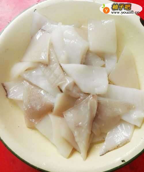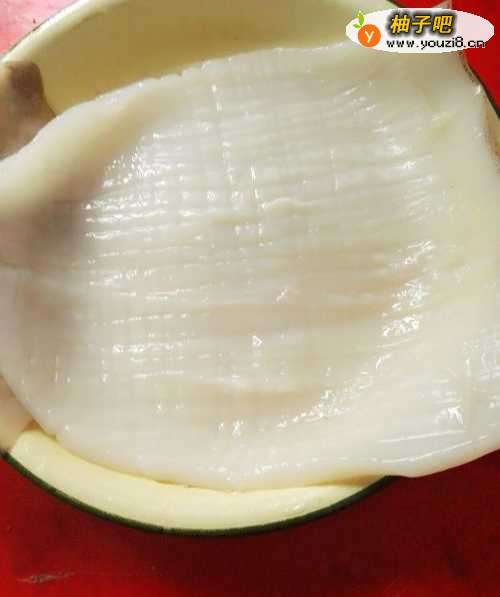 22,把鱿鱼打花,就是先切竖条,再切横条交叉成花。