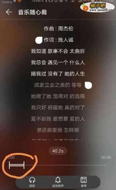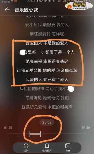 5假如我喜欢这35秒中的这几句歌词,那么我们就把裁剪符号拉到相应位置,如图所示,然后我们选择设置为铃声