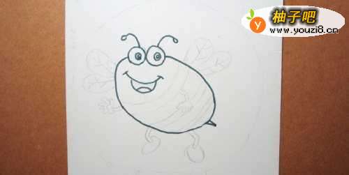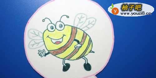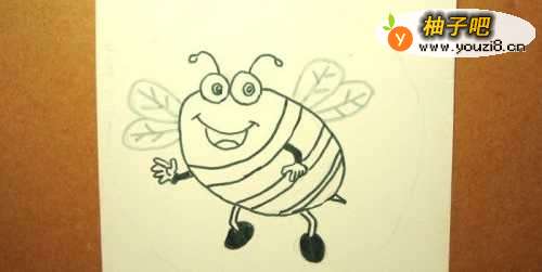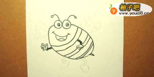 2接着,用铅笔画出可爱的卡通小蜜蜂的草稿图,并用黑色水彩笔画出小蜜蜂的头和身体的部分出来,并画出小蜜蜂的眼睛和嘴巴的图形,如下图所示。