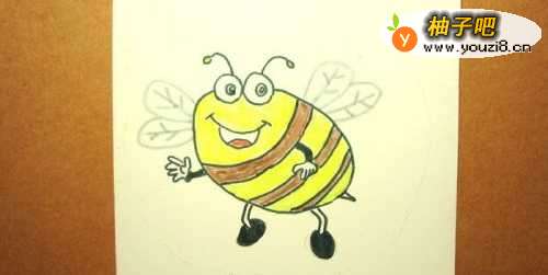5然后,用橘色彩色笔给可爱的卡通小蜜蜂的身体涂上颜色,并用棕色彩色笔给小蜜蜂身体上的斑纹涂上颜色,如下图所示。