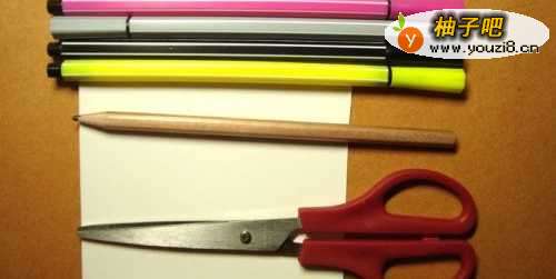 准备好制作可爱的卡通小蜜蜂书签的工具和材料,有卡纸、彩色笔、铅笔、橡皮、直尺、剪刀,材料准备齐全,这样在制作时可以提高制作的速度,如下图所示。