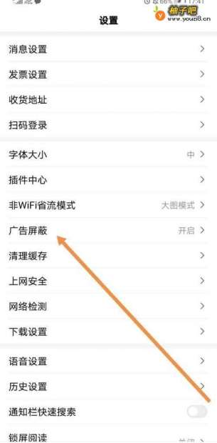 3点击打开设置后,如图所示找到广矿雁丽告屏蔽。