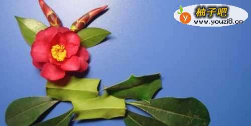 4然后拼装快乐的小山羊的身体部分。由三片长四角形树叶所组成。可正反摆放树叶,摆放的位置,如下图所示。