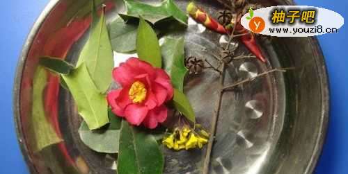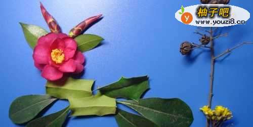 把所需要的叶子和花全部放在一个铁盘子里,这样在找花和叶时会比较方便。而且孩子在盘子里找素材时,花和叶也不会掉在地上造成损坏。