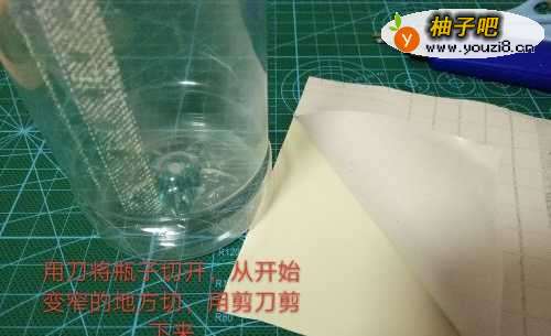 2将剪开的塑料瓶下面部分的瓶口剪平整,将PVC贴纸的那层撕下来,沿着下面者贴。上面要留出一部分,把切口包起来。
