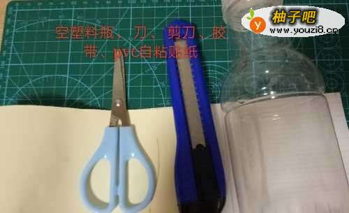 准备好工具,如图,首先将饮料瓶用到沿宽窄相接的地方划开 一个口子,划开后用剪刀剪开,裁一段长度比瓶口略宽的PVC贴纸。