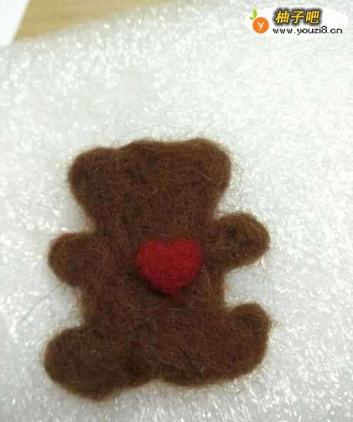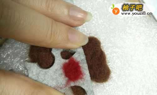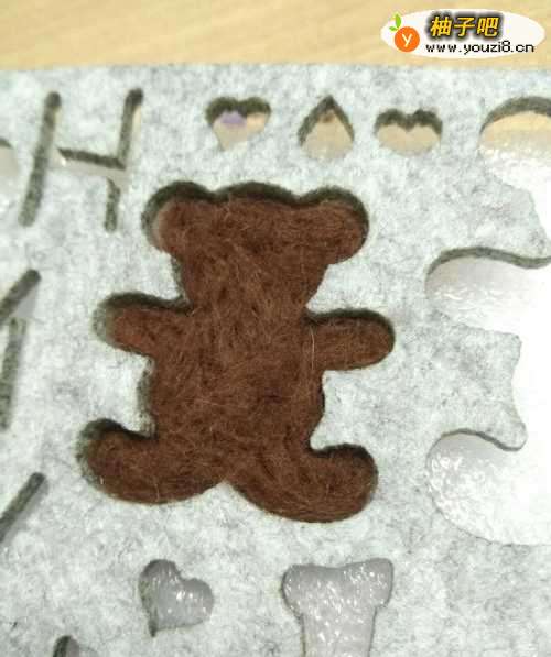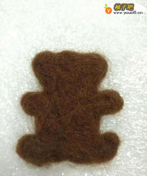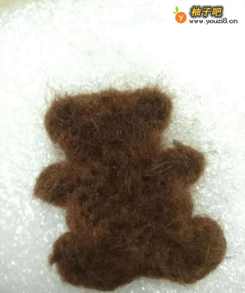 在模具形状内均匀铺放一层棕色羊毛,用粗戳针定型。