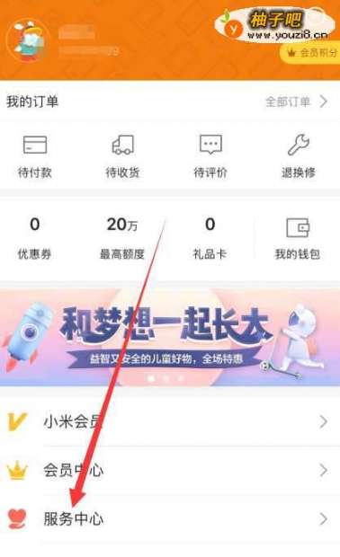 3进入我的页面后,如下图红标位置所示。在我的页面中找到服务中心入口。