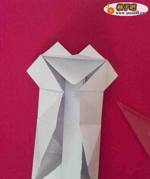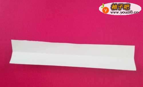 10再取一张长方形白纸,,延着长边对折(主要是加强强度) 。按图示,小心插入白的嘴巴处,反折
