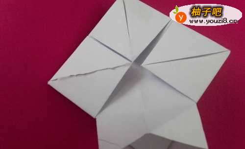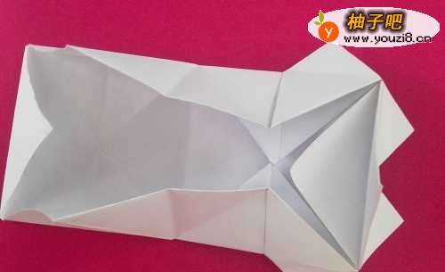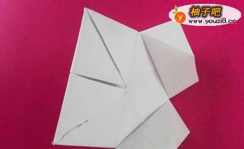 8将另一面翻转朝上,另两个尖角,拆开,顺折缝,捏成长条形状(尾部可折可不折)