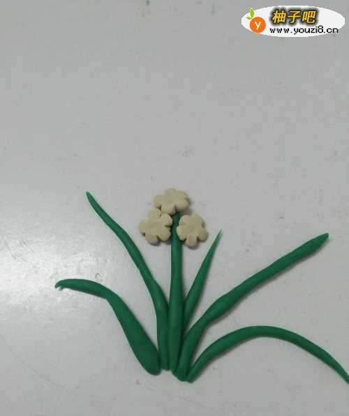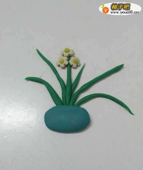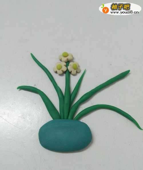 水仙花绿叶子、白花朵,看着特别清新淡雅,下面就来捏一盆水仙花。