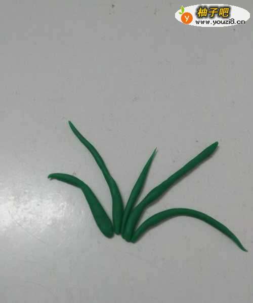 2用小刀将绿色长条切成长短不一的几条,每一条的末端搓成尖的,粘在一起,当作水仙花的绿叶。