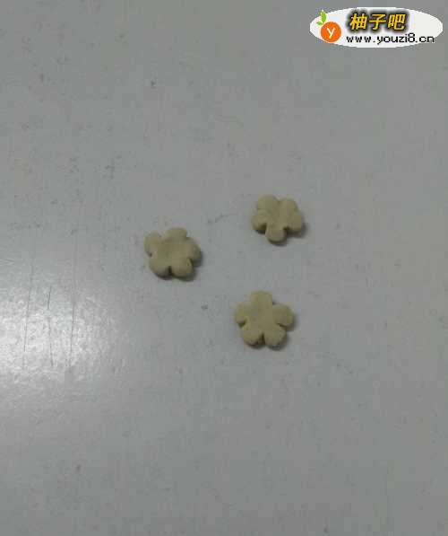 4用白色彩泥捏三个小圆球,再用手按成圆圆的扁片,用小刀在每个圆形边缘刻五下,刻成一朵六片花瓣的水仙花。