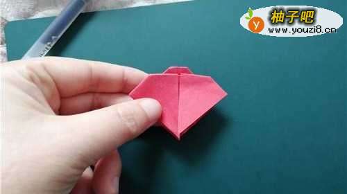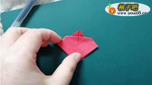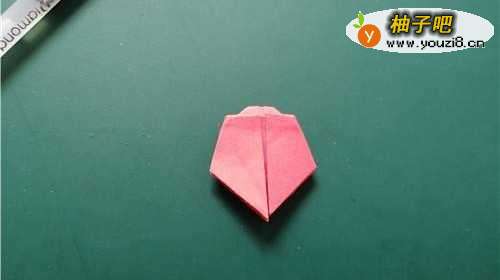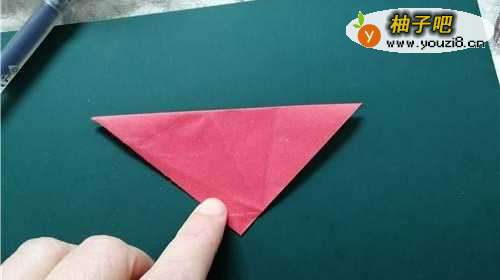 2我们把彩纸的上角向下对折,如图一。再把两侧的角向内折,如图二。