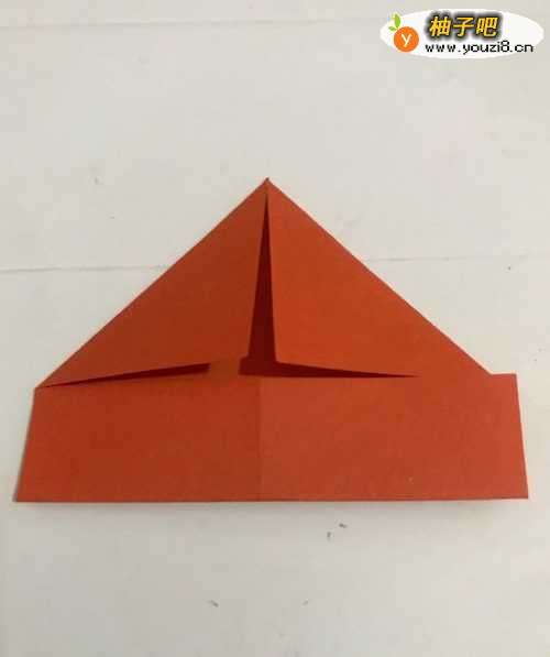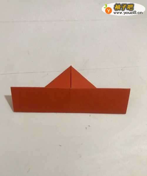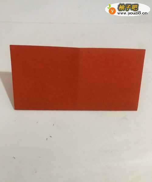 第一步 首先取八分之一张正方形橙色彩纸 把它平放 然后从下向上对边折叠 再 把它取开 将折痕竖起来 再次从下向上对边折叠
