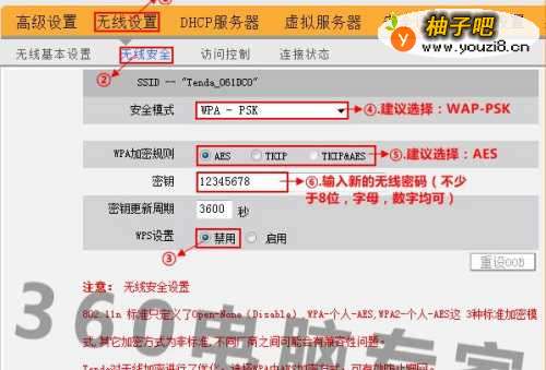 2设置无线连接的密码,根据下图进行设置。不同品牌路由器的设置界面不同,但大同小异,通过上图的引导完全可以完成相关设置。电脑打开无线网卡查找设定的无线网络名称,点击连接,输入设定的密码即可正常进行连接。
