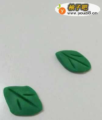 7用绿色捏两个枣核形状,当作两个叶子,在叶子上面刻一个小字,当作叶脉。