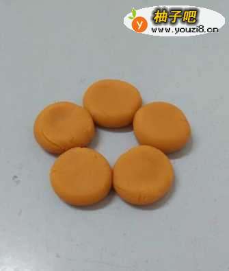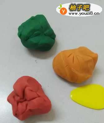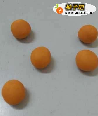 3把桔黄色长条分成一样大的五块,然后把五块橡皮泥团成圆球。