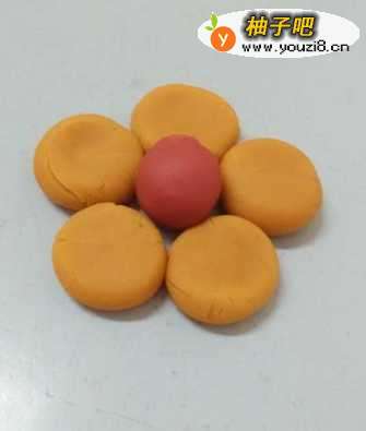 4把五个圆球按成扁片,围成一朵花。
