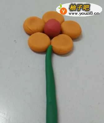 6用绿色搓一个细长条,粘在花朵下面,当作花茎。